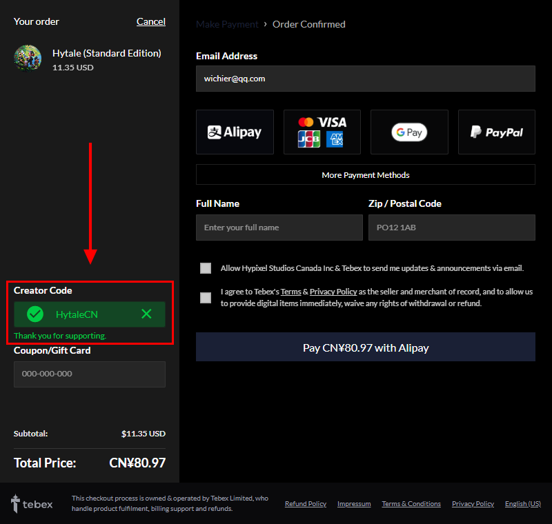 HytaleCN来表示对我们的支持。这可以让我们获得你实际支付金额 5% 的佣金。非常感谢你的支持!