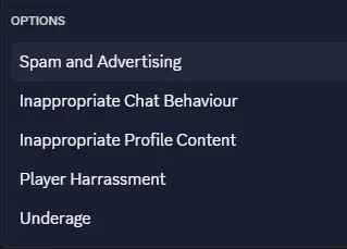 接着,你需要根据该玩家的行为选择相应的违规选项。只需点击原因字段,并从以下选项中选择即可: