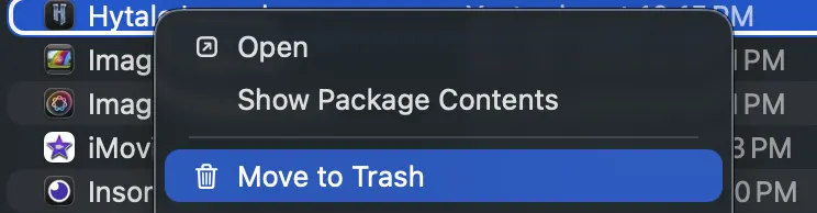 在 macOS 上卸载启动器时,前往 Applications 文件夹,然后右键点击 Hytale 启动器并选择 Move to Trash。如需了解更多有关在 macOS 上删除应用的帮助,请查阅 Apple 关于 在 Mac 上删除或卸载应用 的指南。